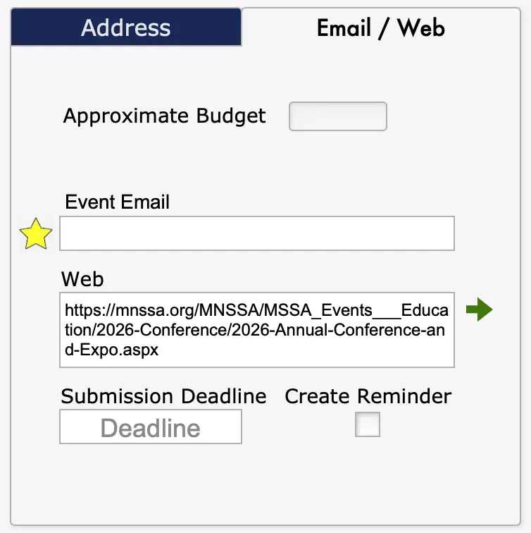 The Email/Web tab contains fields to track the dedicated email and web addresses for the event, along with the submission deadline date. Check the Create Reminder box to set a Task which will appear at the appropriate date on the built-in Speaker Compass Calendar.