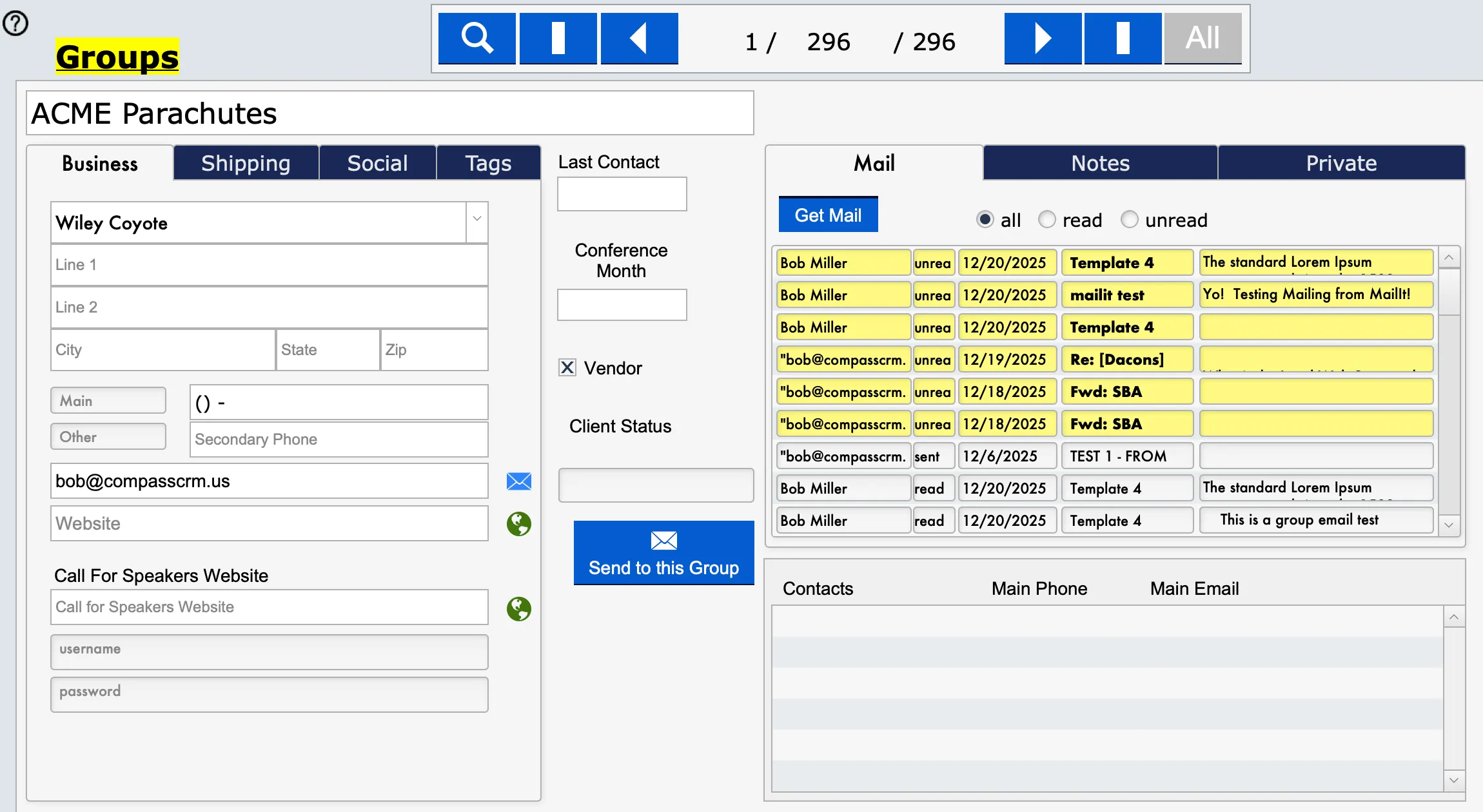 However, using the integrated Compass Mail helps maintain focus on one client at a time. Look at the Mail tab in the main Compass Groups Window. The only emails that appear in the tab are from that customer, organization, or group. There's no personal emails, or spam, or emails from anyone except that customer. And the unread emails are highlighted so you can see at a glance if there's any new communications with the customer or prospect!