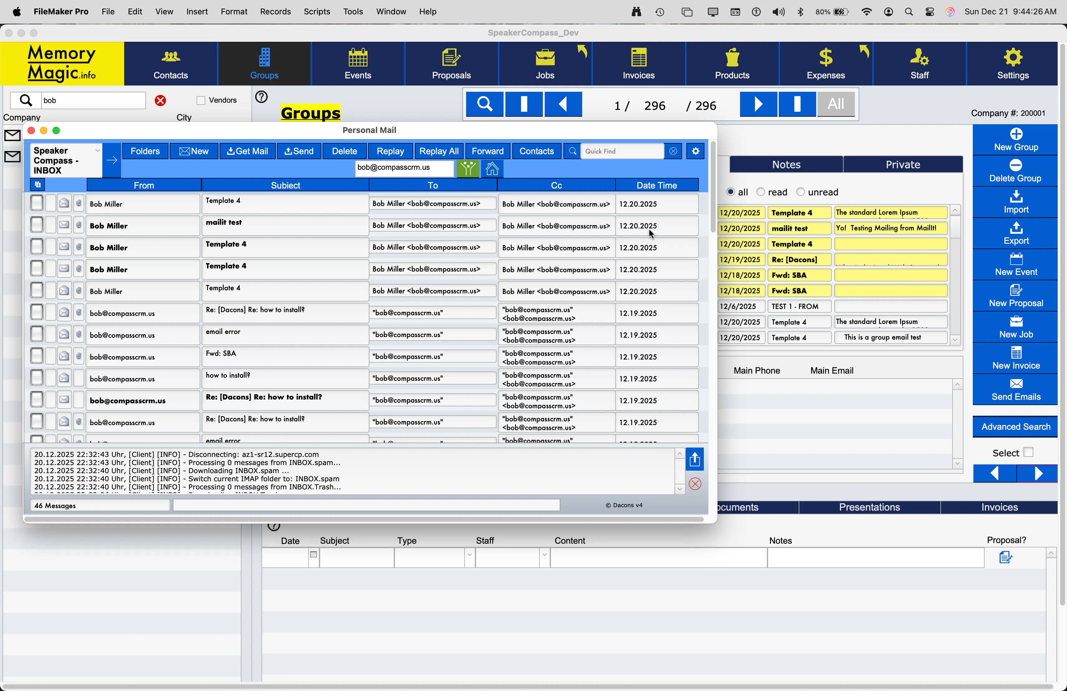 This picture shows how the Compass Mail window opens on top of the Speaker Compass main window. The mail program shows your entire email history: every email sent from anyone, just as you'd expect.