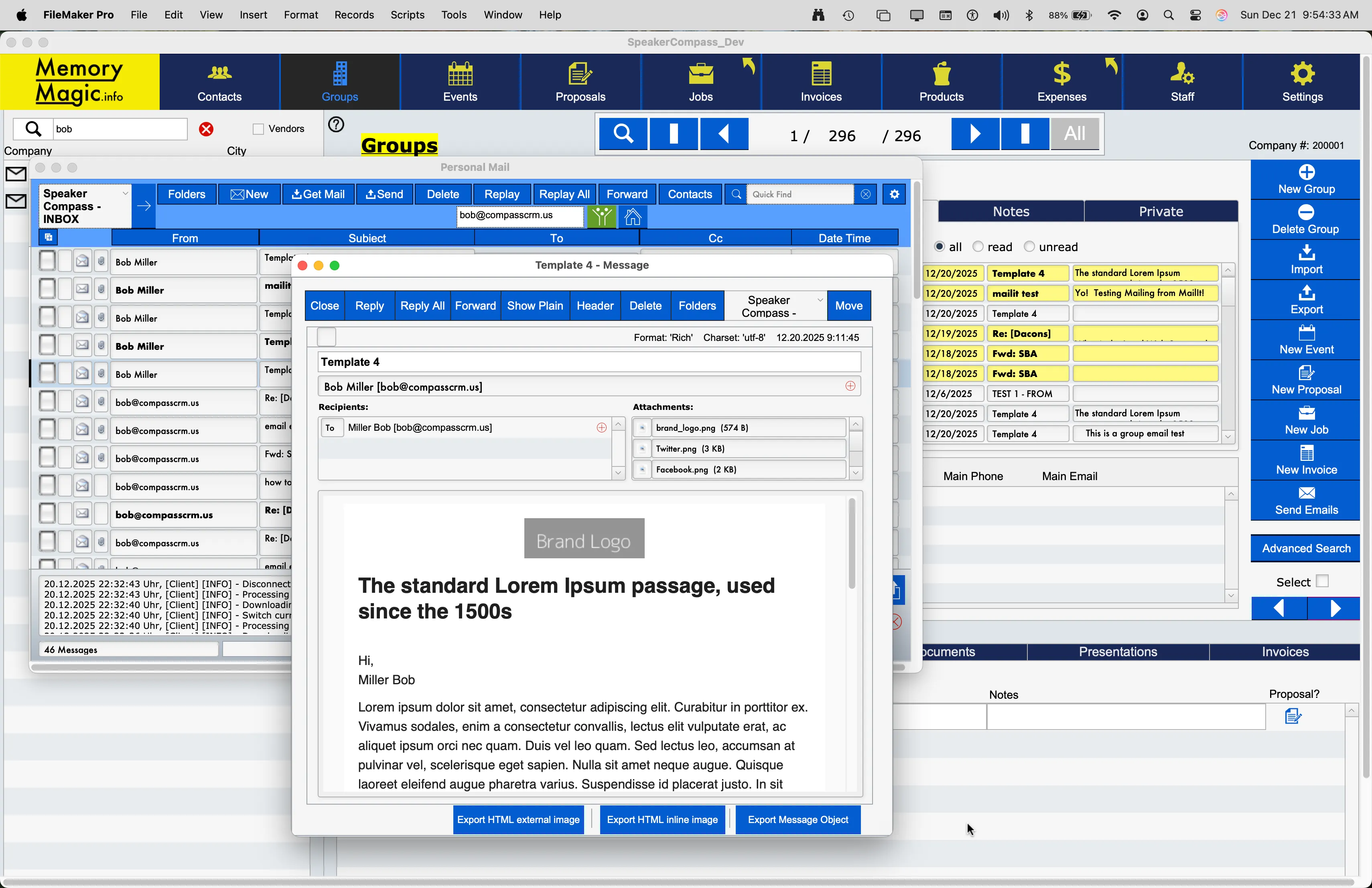 Although Speaker Compass is an offline program, it has a powerful email system. You could say it has one and half email systems.